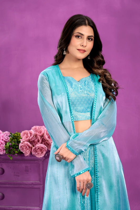 Firoji Soft Silk Top Plazzo and Shrug 3 Piece Set For Women