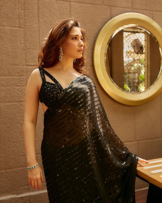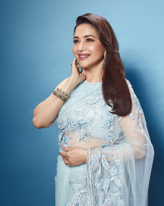 Madhuri Dixit Bollywood Inspired Sequins Butterfly Mono Net Saree - Sky blue